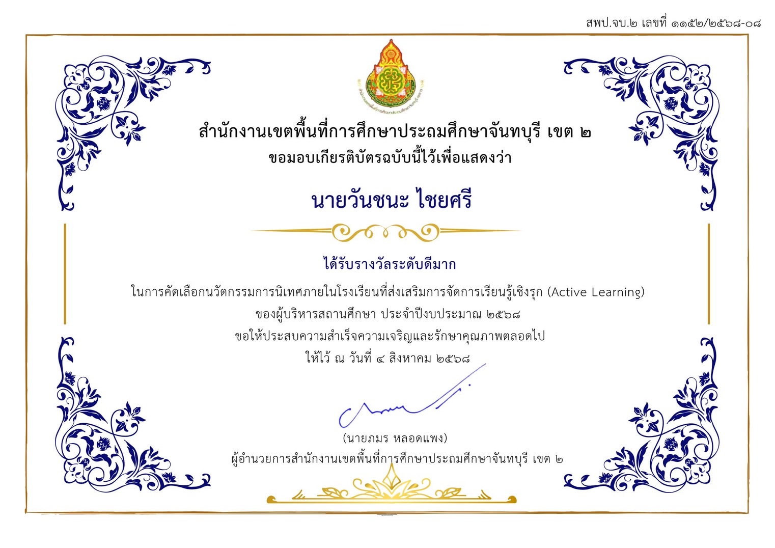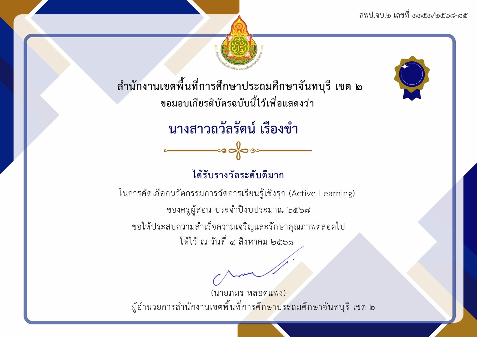 รางวัลระดับดีมาก ในการคัดเลือกนวัตกรรมการจัดการเรียนรู้เชิงรุก (Active Learning) ของครูผู้สอน ประจำปีงบประมาณ 2568