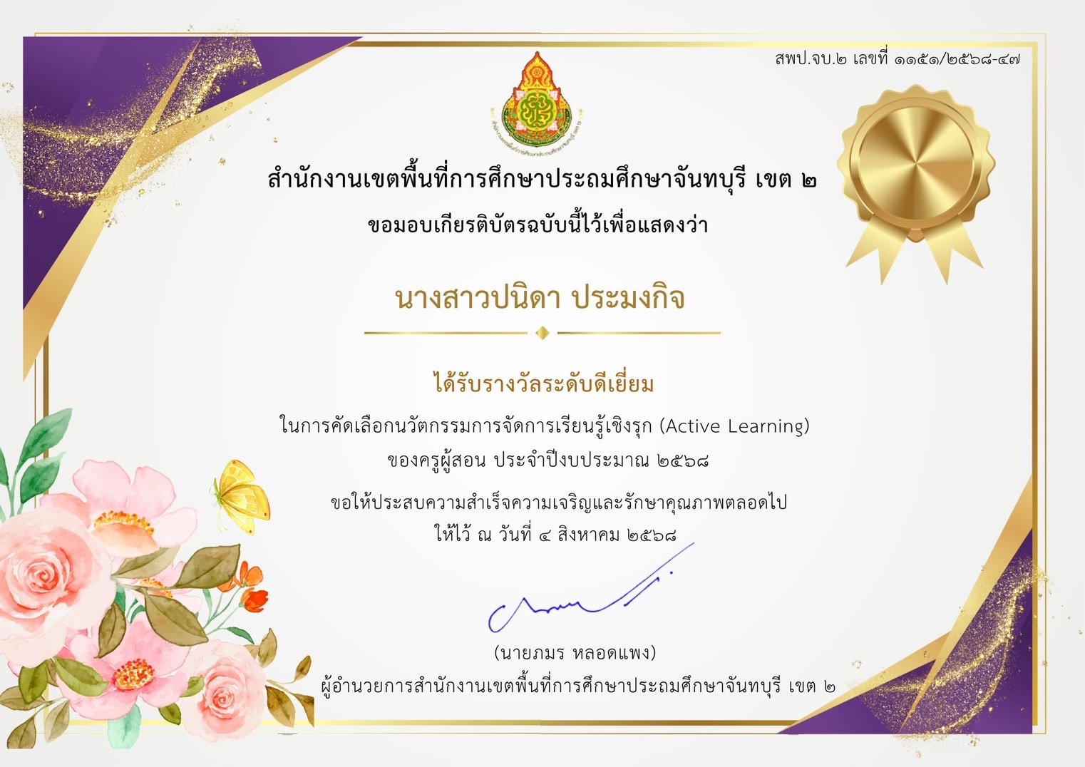 รางวัลระดับดีมาก ในการคัดเลือกนวัตกรรมการจัดการเรียนรู้เชิงรุก (Active Learning) ของครูผู้สอน ประจำปีงบประมาณ 2568