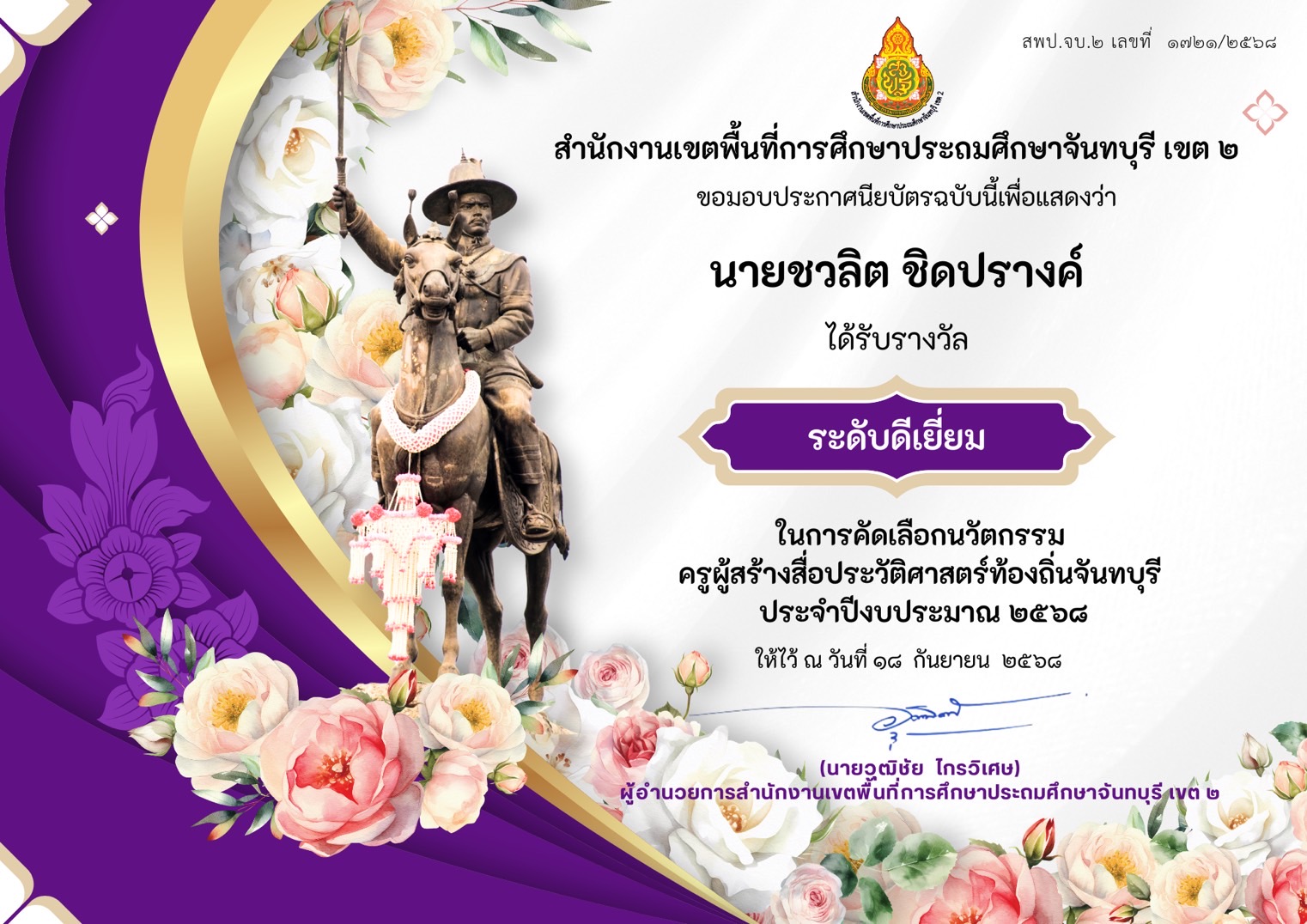รางวัลระดับ ดีเยี่ยม ในการคัดเลือกนวัตกรรม ครูผู้สร้างสื่อประวัติศาสตร์ท้องถิ่นจันทบุรี ประจำปีงบประมาณ 2568