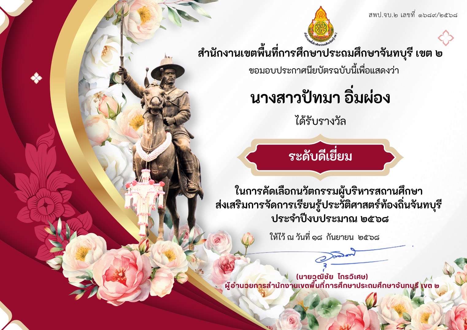 ขอแสดงความยินดีกับ นางสาวปัทมา อิ่มผ่อง ได้รับรางวัลระดับ ดีเยี่ยม ในการคัดเลือกนวัตกรรมผู้บริหารสถานศึกษา ส่งเสริมการจัดการเรียนรู฿้ประวัติศาสตร์ท้องถิ่นจันทบุรี ประจำปีงบประมาณ 2568